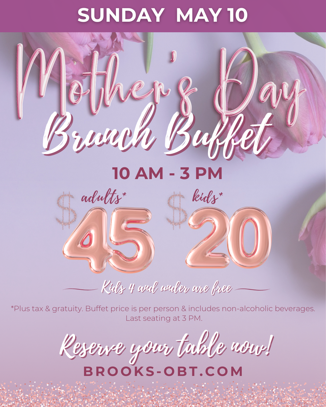 Leave the holiday planning to Brook’s and join us for our Mother’s Day Brunch Buffet on Sunday, May 10th from 10AM - 3 PM!