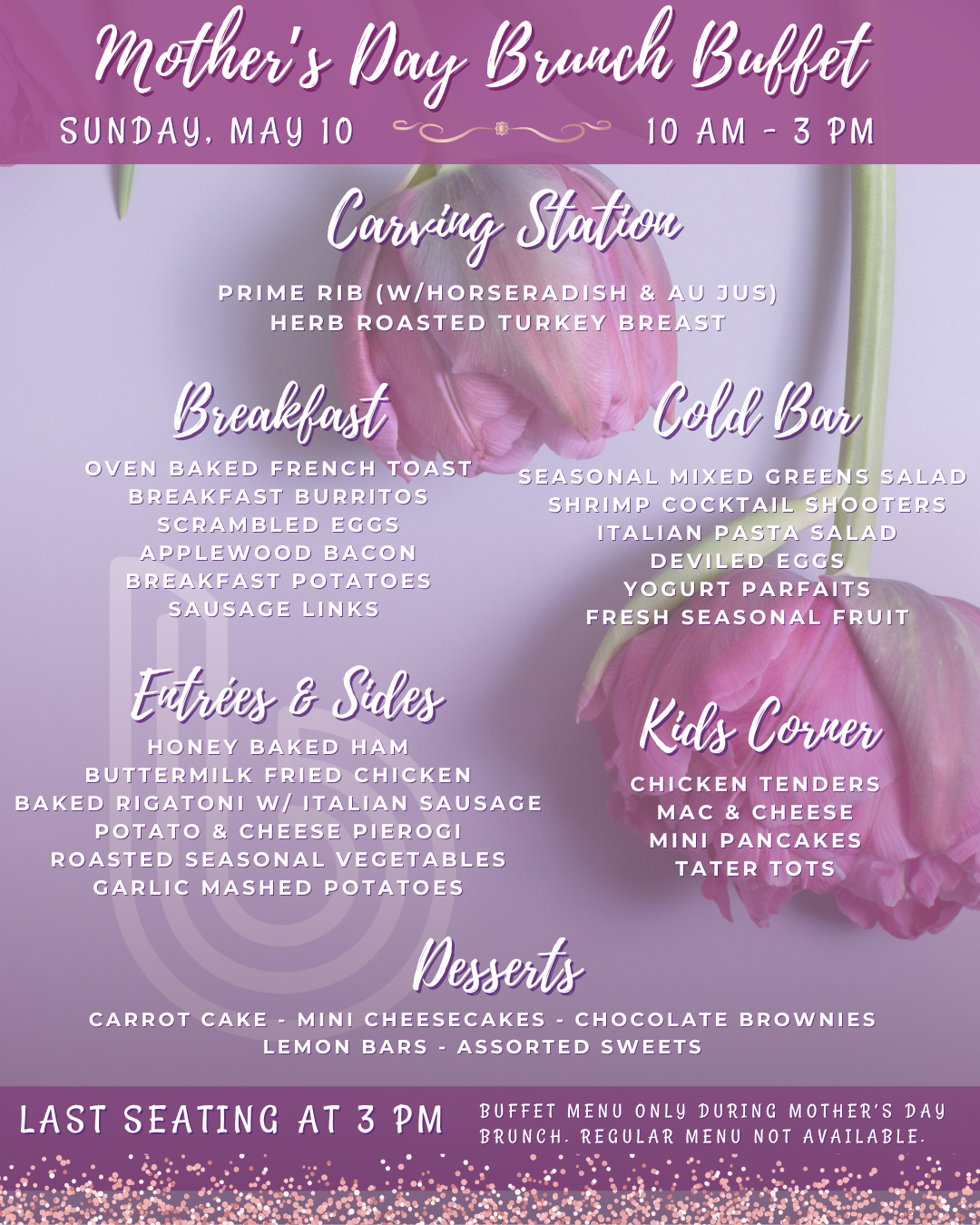 View our Mother’s Day Brunch Buffet Menu below. [Last seating at 3PM. Regular menu not available during buffet]: